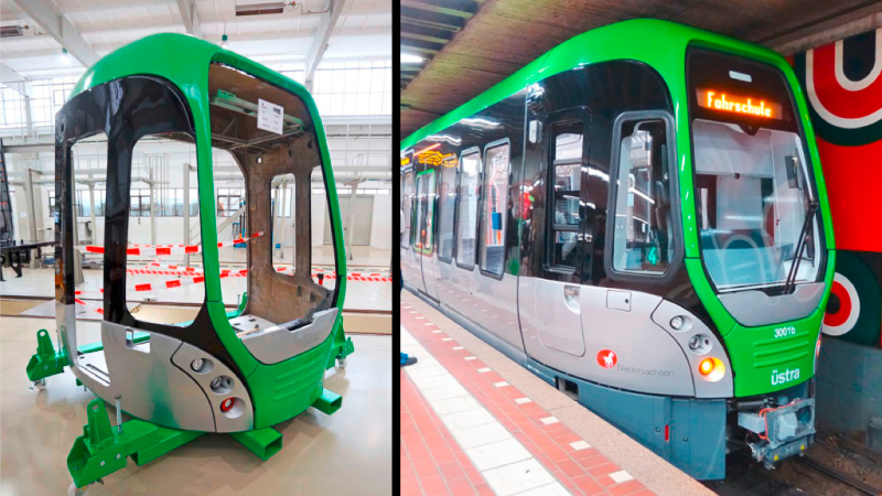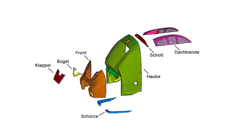 Besonders bei der Fertigung von Kleinserien spielen faserverstärkte Kunststoffe ihre Stärken aus. Präzise Komplettverkleidungen von Schienenfahrzeugen bieten dem Wind nur minimale Angriffsflächen. Das gilt auch für einteilige Kopfstücke - als selbsttragendes Sandwichelement - für Schienenbusse und Doppelstocksteuerwagen.